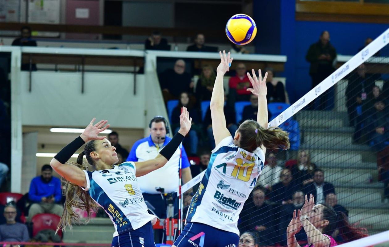 Coach Negro fa un po’ di turnover lasciando inizialmente a riposo Nemeth, Gray e Nervini: al loro posto Dambrink, Alberti e Bah. Le biancoblù partono bene e nel primo set fila tutto liscio: lo strappo da 10-10 a 10-14 viene gestito in scioltezza fino al 16-25 firmato da Dambrink.