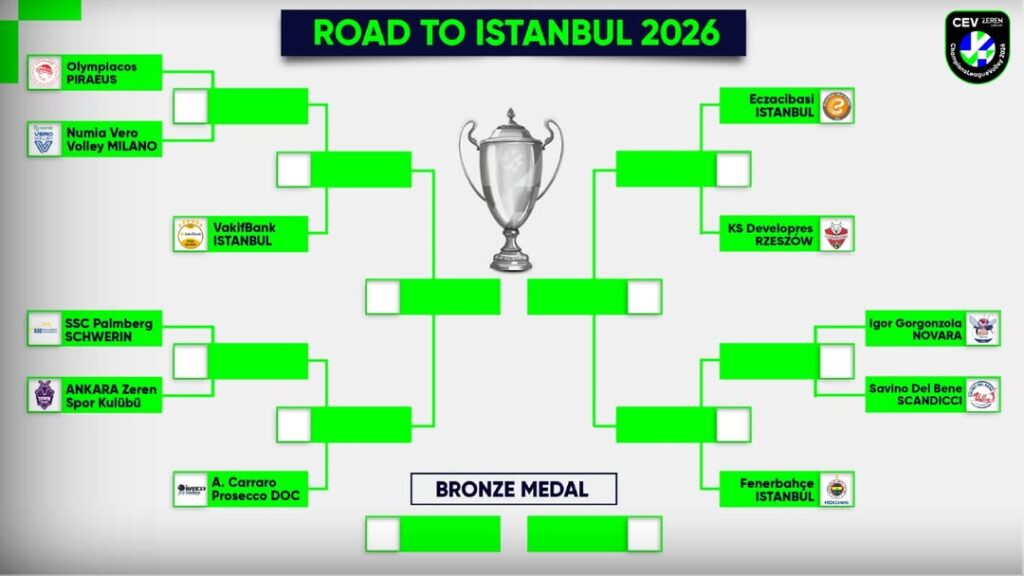 Qui invece abbiamo da una parte del tabellone il Fenerbahce (1B) che affronterà nei quarti Scandicci (2A) o Novara (2B). Sull’altro lato del tabellone Conegliano (1D) che ai quarti affronterà la vincente di Zeren (2D) e lo Schwerin (2E). Sempre da questa parte il VakifBank (1A) che ai quarti se la vedrà con la vincente tra Milano (2C) e Olympiacos (3C). Unica eccezione l’accoppiamento ai quarti tra Eczacibasi (1C) e Resovia (1E).