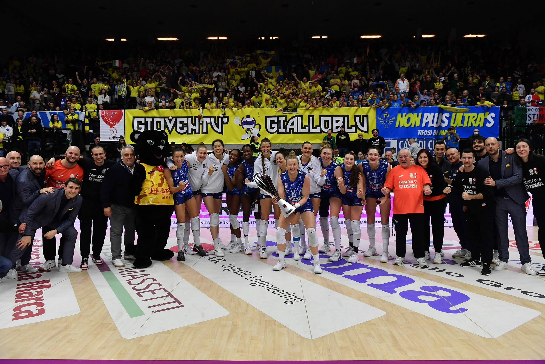 L’entusiasmo del Palaverde continua anche dopo la partita. Capitan Wolosz e compagne sfilano con la Coppa Italia conquistata a Torino domenica scorsa, l’ottava della storia gialloblù, il 30° titolo della storia del club. Prima, nel megaschermo parte il video emozionale che ripercorre il successo, il pubblico gialloblù ha riabbracciato oggi le Pantere per la prima volta dopo il successo.