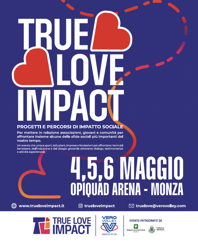 Il Consorzio Vero Volley scende in campo con il progetto True Love Impact, che si propone di affrontare in maniera sistematica le principali fragilità che interessano soprattutto le fasce più giovani della popolazione. Proprio per questo nasce la prima edizione di True Love Impact, che si terrà dal 4 al 6 maggio all’Opiquad Arena di Monza, con l’obiettivo di sviluppare azioni concrete capaci di rispondere alle principali criticità sociali che coinvolgono le nuove generazioni spaziando dai temi del benessere, dell’inclusione e del disagio giovanile. Saranno quattro le macro-categorie principali, che saranno ulteriormente articolate in ambiti specifici che prendono spunto dall’ultima Relazione annuale al Parlamento sul fenomeno delle tossicodipendenze stesa dal Dipartimento delle Politiche Sociali della Presidenza del Consiglio dei Ministri.