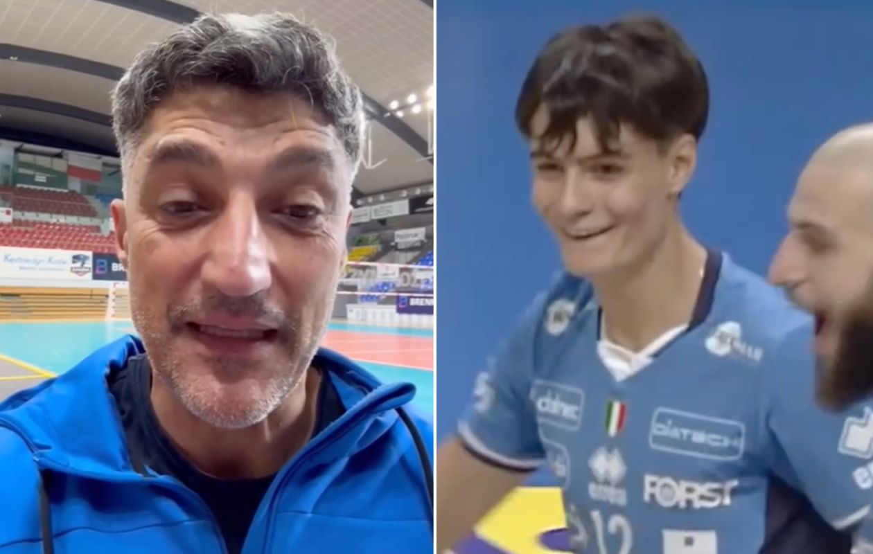 Il ragazzo, classe 2007, 196 cm d’altezza, sul sito di Lega non compare neanche nel roster dei dolomitici, eppure nel giorno del suo esordio in Superlega ha piazzato un attacco vincente e un ace all’incrocio delle righe, entrambi da lustrarsi gli occhi. A tal punto che Andrea Giani, l’originale, ha voluto mandargli un video messaggio (qui in basso) molto carino per congratularsi e fargli un grande in bocca al lupo.