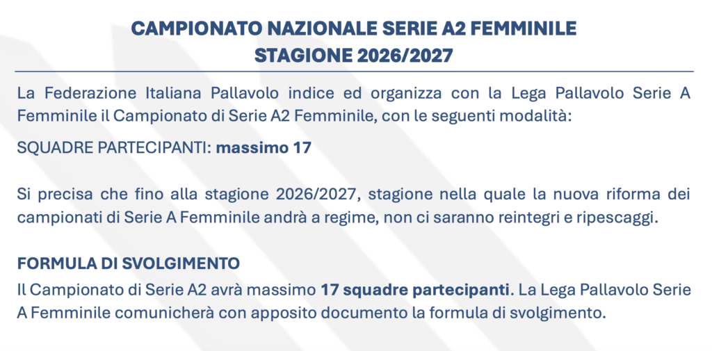Sono ore di alta tensione queste tra i vertici della Lega Volley Femminile e quelli della Federazione. Tutto colpa del Club Italia, retrocesso sul campo ma ‘imposto’ dalla federazione ancora in Serie A2 il prossimo anno. Solo qualche giorno fa l’ad di Lega Enzo Barbaro, in esclusiva ai nostri microfoni, aveva ‘spoilerato’ che finalmente nella prossima stagione l’A2 sarebbe stata a girone unico a 16 squadre. Nella Guida Pratica 2026/2027, invece, la Federazione ha riportato quanto segue: