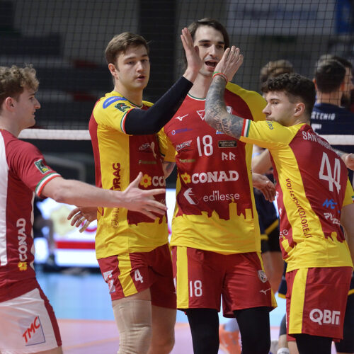 Senza i Nazionali ancora impegnati agli Europei e nell’imminente World Cup (l’opposto Patry e gli schiacciatori Van Garderen, Palacios e Karlitzek, quest’ultimo appena eliminato dagli Europei con la sua Germania) in avvio il coach Lorenzo Tubertini schiera Sottile in cabina di regia opposto a Onwuelo, di banda due giovanissimi Rossato (2001) e il secondo libero Rondoni (1999), al centro Szwarc e Rossi con Cavaccini libero.