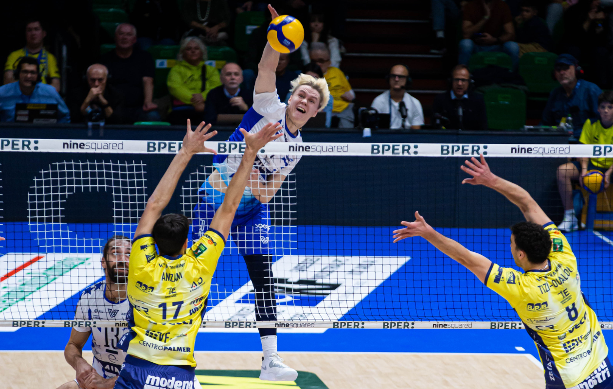 Avvio equilibrato e combattuto, Buchegger a segno e 13-13 dopo i primi cambi. Modena passa avanti, Anzani non sbaglia (19-16). La formazione di Alberto Giuliani continua a spingere e porta a casa il primo set con il pallonetto vincente di Mati per il 25-19. Modena comincia forte anche nel secondo parziale. I gialloblù non mollano di un centimetro e lottano su ogni pallone con grinta e determinazione. Davyskiba sale in cattedra con tre ace consecutivi (23-15). L’attacco di Buchegger chiude un set controllato (25-17). Nel terzo parziale Monza prova a reagire al doppio svantaggio, ace di Atanasov e 11-15. Gli ospiti si mantengono avanti, battuta vincente di Larizza e 15-20 con time out di Giuliani. Modena risponde colpo su colpo e rientra in partita: ace di Ikhbayri per il 22-22 e parità. Nel finale si lotta punto a punto, sono i canarini ad avere la meglio e a conquistare l’intera posta in palio mettendo il sigillo finale (26-24).