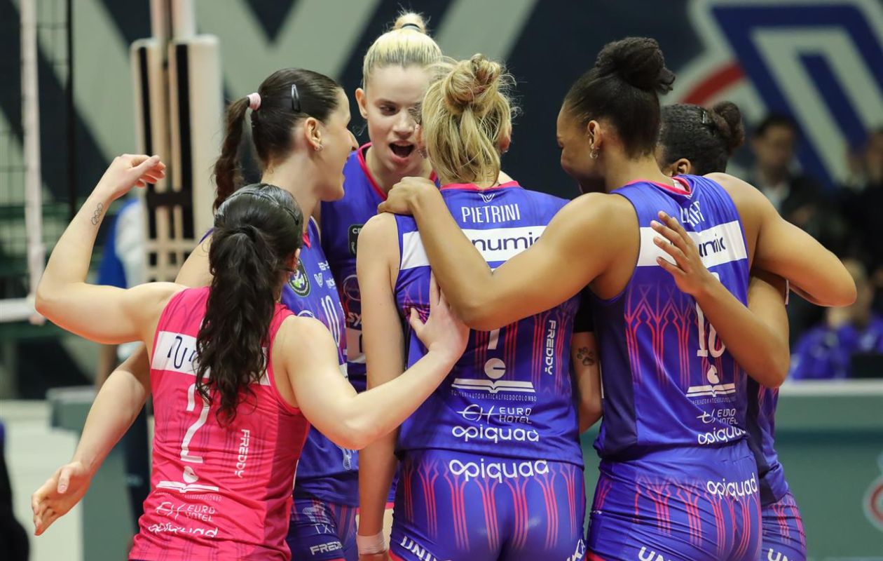 Vittoria straordinaria per la Numia Vero Volley Milano in CEV Champions League. Davanti al pubblico di casa dell’Opiquad Arena la formazione di coach Lavarini ha espresso tutto il suo valore e, con una pallavolo di alto livello e una Elena Pietrini in splendida forma, è riuscita ad aggiudicarsi con il punteggio di 3-0 (25-12; 25-18; 25-11) anche la gara di ritorno dei Play Off contro l’Olympiacos Piraeus. Con il successo di questa sera le rosablu hanno centrato uno degli obiettivi di questa stagione: l’accesso ai Quarti di Finale della massima competizione europea, dove affronteranno le turche del VakifBank Istanbul per giocarsi un posto nella Final Four del 2-3 maggio. (Qui la cronaca dell’incontro)