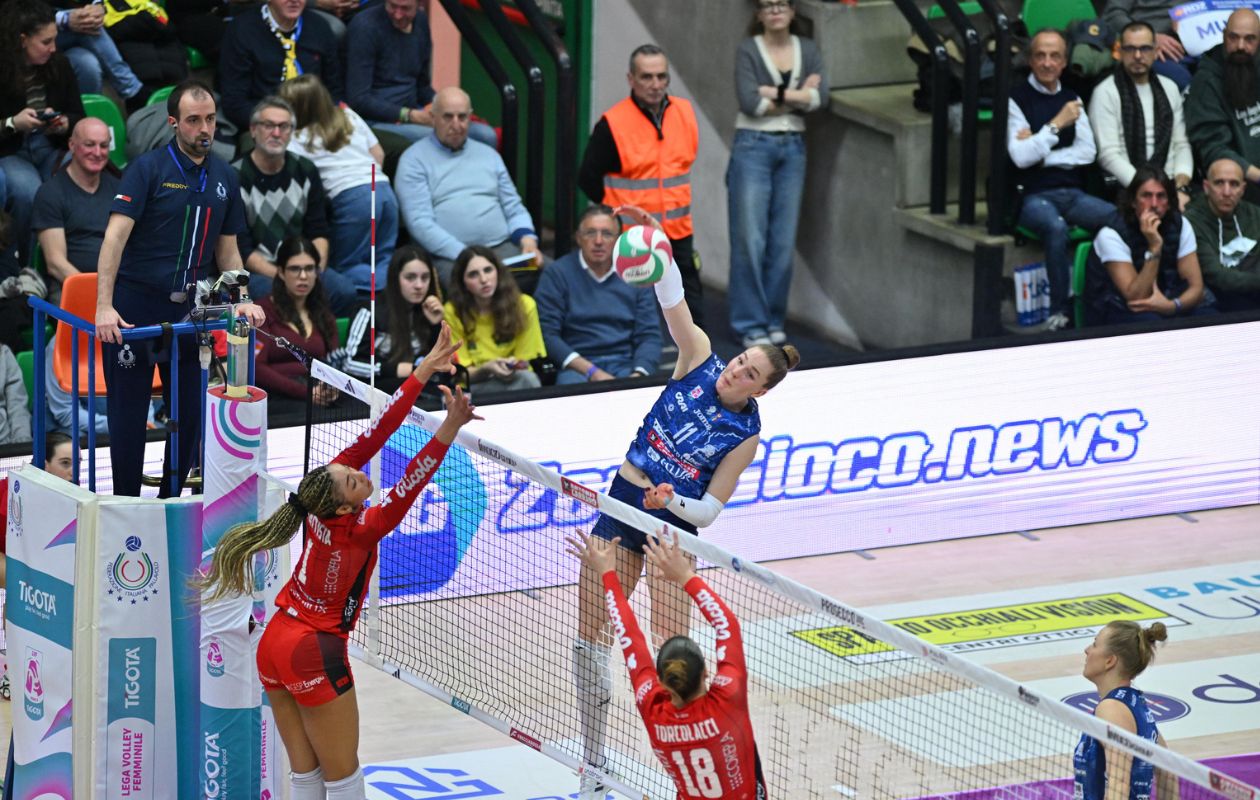 Secondo set – Tira e molla a inizio secondo set, Battista pesca l’ace e Lubian inaugura la sua gara a muro (4-4); con Gennari l’UYBA si prende un break di vantaggio (5-7), le Pantere restano in scia con il muro di Haak (10-11) e con un turno a servizio velenoso di Gabi. Serve un time-out taumaturgico di coach Santarelli per dare il cambio di passo al set (12-17): Haak si mette in proprio in attacco e a servizio (14-17, 12 punti), cambiano momentaneamente i posti 4 con gli ingressi di Sillah e Daalderop (17-20), Zhu torna e impatta (21-22, 20 punti alla fine con 2 muri per la numero 4 della Prosecco DOC). Le farfalle sono più ciniche in coda e si portano sull’1-1 con il servizio di Battista (22-25).