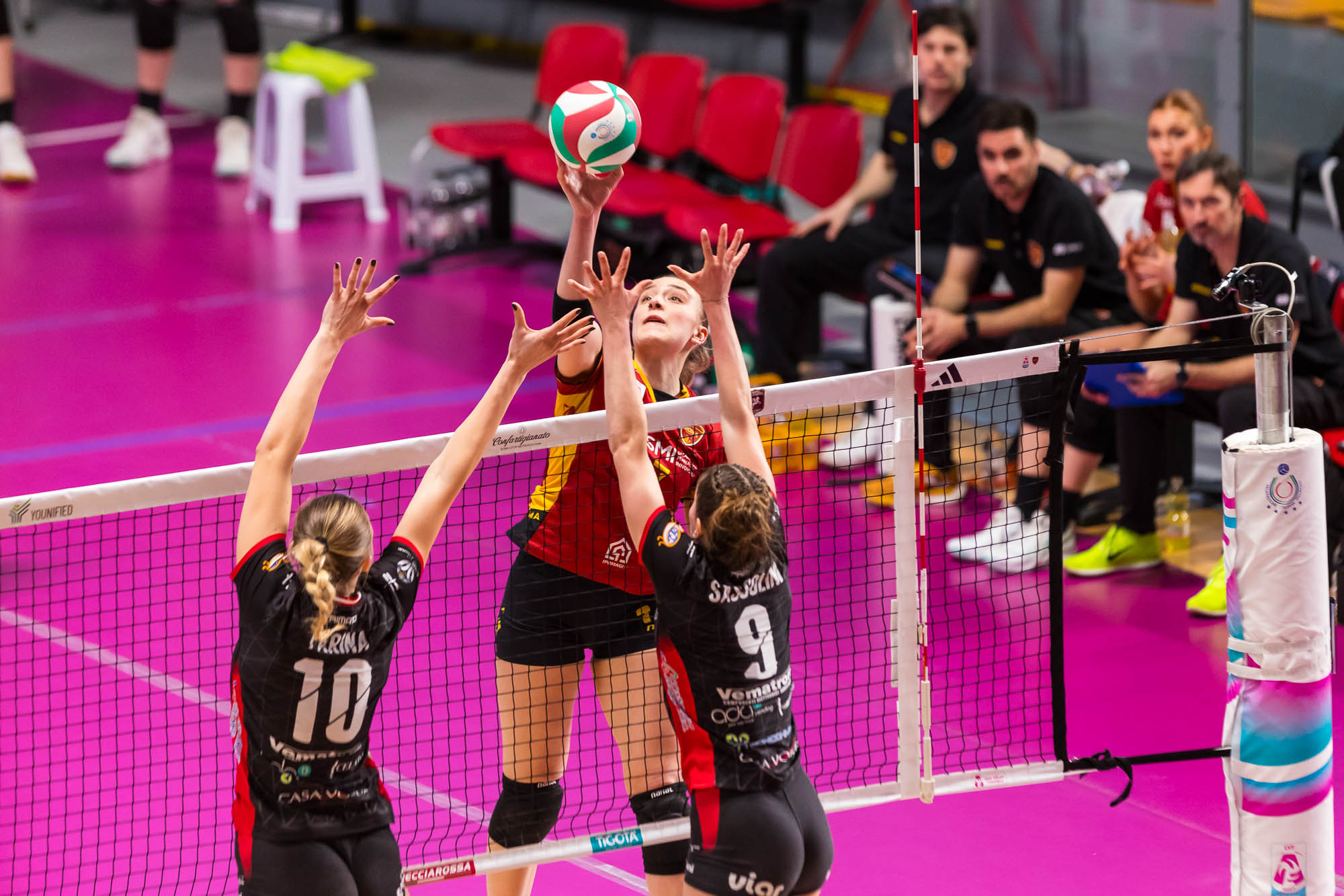Nel bellissimo e quanto mai caldo clima del PalaTiziano, la squadra allenata da coach Mauro Tettamanti si gasa, regala spettacolo e decide di indossare l’abito delle occasioni importanti, lottando con “cazzimma” su ogni pallone, mettendo per larghi tratti alle corde le Wolves. Alla fine a fare la differenza è con ogni probabilità la prova monstre di Nikoleta Perovic: sono stati necessari 41 suoi punti per piegare Rebora e compagne con un super 42% offensivo, 5 muri e tanta freddezza nei momenti decisivi. In casa Futura Volley spiccano i 26 punti di una Alyssa Enneking sempre più inserita nei meccanismi biancorossi, i 18 di Marika Longobardi, il 51% di ricezione perfetta di Sophie Blasi ma in una serata del genere risalta soprattutto il fondamentale contributo della panchina: Arita Ternava sicura e preziosa in posto 2, Alessandra Talarico non solo centrale ma anche tuttofare tra difese d’istinto e tanto altro lavoro oscuro, Bianca Orlandi come sempre solida in seconda linea ed efficace in attacco, Silvia Sormani collante della retroguardia e reattiva in difesa.