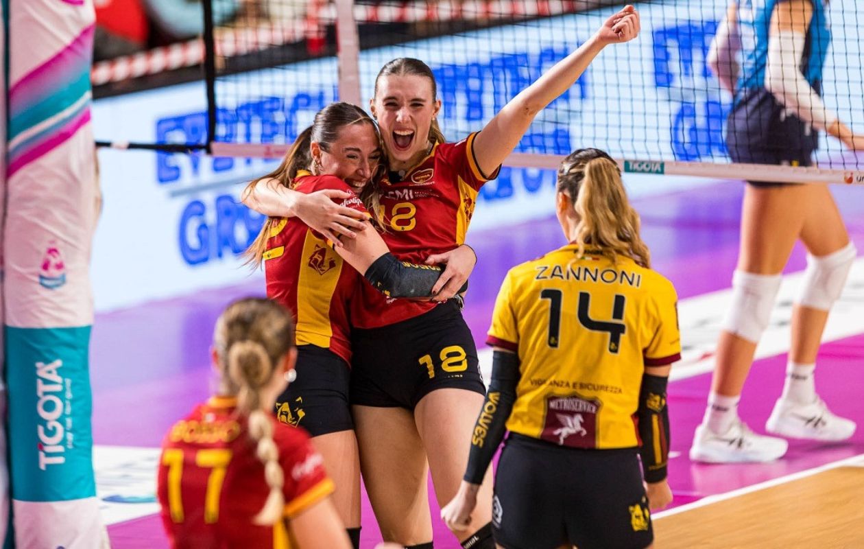 Al Palazzetto dello Sport di Roma va in scena una delle partite più intense di questo inizio di stagione nel girone A del Campionato di Serie A2 Femminile: emozioni e spettacolo con le Wolves che si confermano in un momento magico e trovano la sesta vittoria consecutiva nello scontro al vertice con l’Itas Trentino. Dopo aver perso il primo set ai vantaggi (24-26), nella seconda parte di gara le capitoline cambiano marcia e vincono i restanti tre set (25-20, 25-20, 25-22) anche grazie al positivo ingresso di Pecorari (premiata come MVP della sfida), che insieme a Perović (top scorer del match con 23 punti) e Bosso (19 punti) si rivela un’autentica spina nel fianco per la difesa ospite. Spiccano anche i cinque muri messi a segno da Consoli, le illuminanti intuizioni di Guiducci e le sempre ottime percentuali della capitana Zannoni in ricezione. Molto solida comunque la prestazione di tutta la squadra. Un’altra bella vittoria che consente alle giallorosse di chiudere il girone di andata in vetta in coabitazione con Costa Volpino, prossima avversaria in trasferta, domenica 7 dicembre, dopo il turno di riposo. Il successo su Trento regala alla squadra di coach Cuccarini anche la semifinale della Coppa Italia di Serie A2 contro Padova. La conclusione migliore di un pomeriggio di festa iniziato, prima del fischio d’inizio, con la premiazione della squadra giovanile della SMI Roma Volley che nella stagione sportiva 2024/2025 si è aggiudicata il campionato territoriale Under 12.