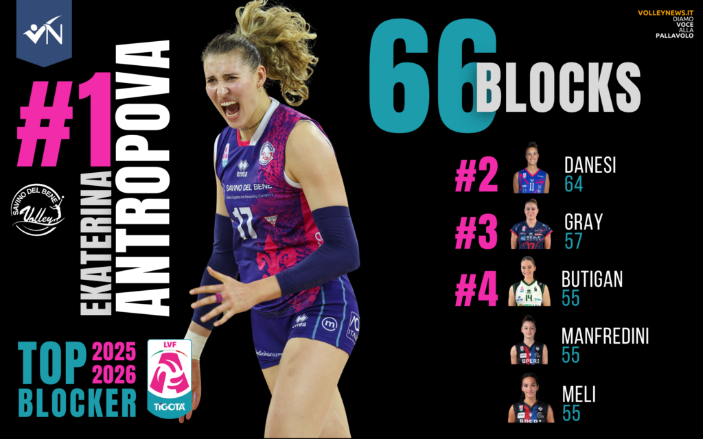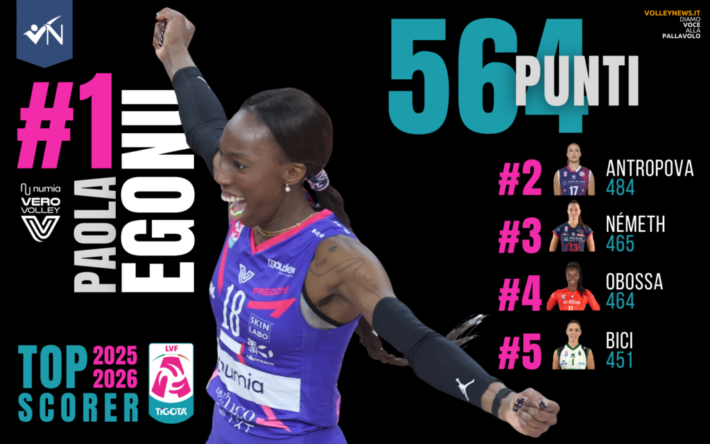 Chiusa la Regular Season 2025-2026, in cima alle classifiche individuali troviamo tre campionesse azzurre. Paola Egonu (Numia Vero Volley Milano) si prende la corona di regina tra le bomber per quinta volta in carriera nel massimo campionato italiano: con 564 punti è lei la TOP Scorer per distacco di questa stagione regolare. In vetta alle classifiche di ace e muri c’è invece Ekaterina Antropova (Savino Del Bene Scandicci). Ministro della difesa (la Lega femminile stila questa classifica in base alla percentuale di ricezioni perfette, ndr) è infine Eleonora Fersino (Numia Vero Volley Milano).