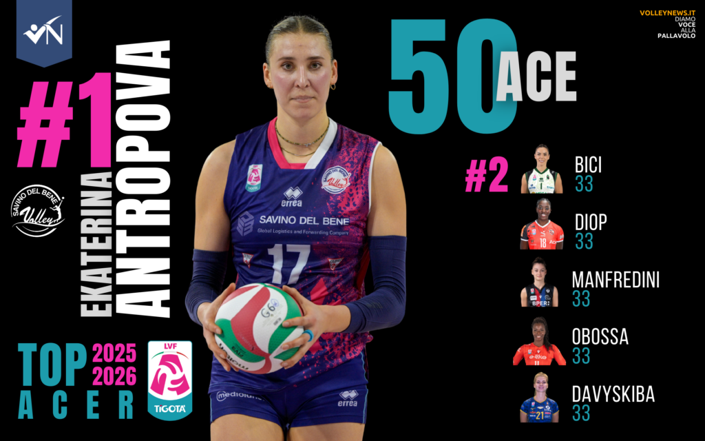 Nella classifica degli ace è proprio a Scandicci ad occupare la prima piazza con 130 battute vincenti (50 di Antropova e 32 di Weitzel). Secondo gradino del podio per la Wash4Green Monviso Volley con 120 ace, di cui 33 sparati da Davyskiba e 22 da D’Odorico. Terzo posto infine la Honda Cuneo Granda Volley con 118. In questo caso il maggior contributo è arrivato da Dio (33) e Keene (20).