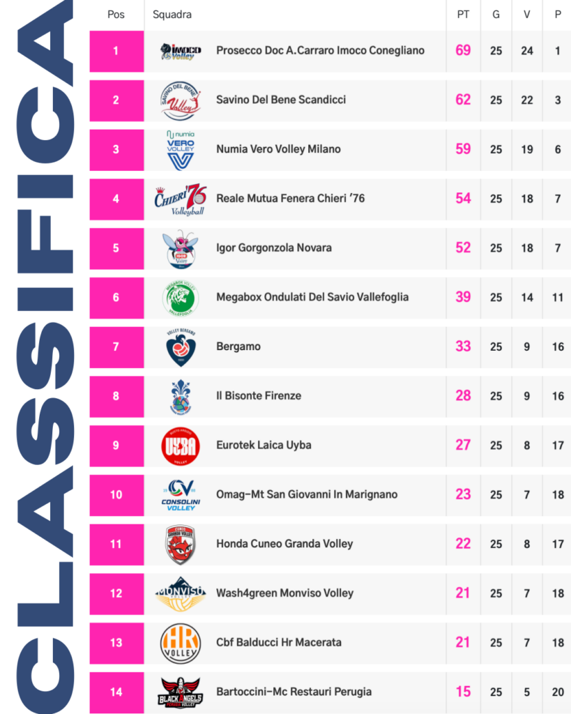 Se su questi tre campi, però, dovessero arrivare risultati sorprendenti, occhio in quel caso anche a San Giovanni in Marignano. La squadra di Bellano è a quota 23 punti, sogna addirittura i Playoff Challenge, ma la matematica certezza della salvezza ancora non c’è. Nell’ultimo turno affronterà in casa l’UYBA, squadra in flessione nell’ultimo periodo ma ancora in piena lotta per l’ottavo posto che vale i Playoff Scudetto (è a -1 da Firenze).