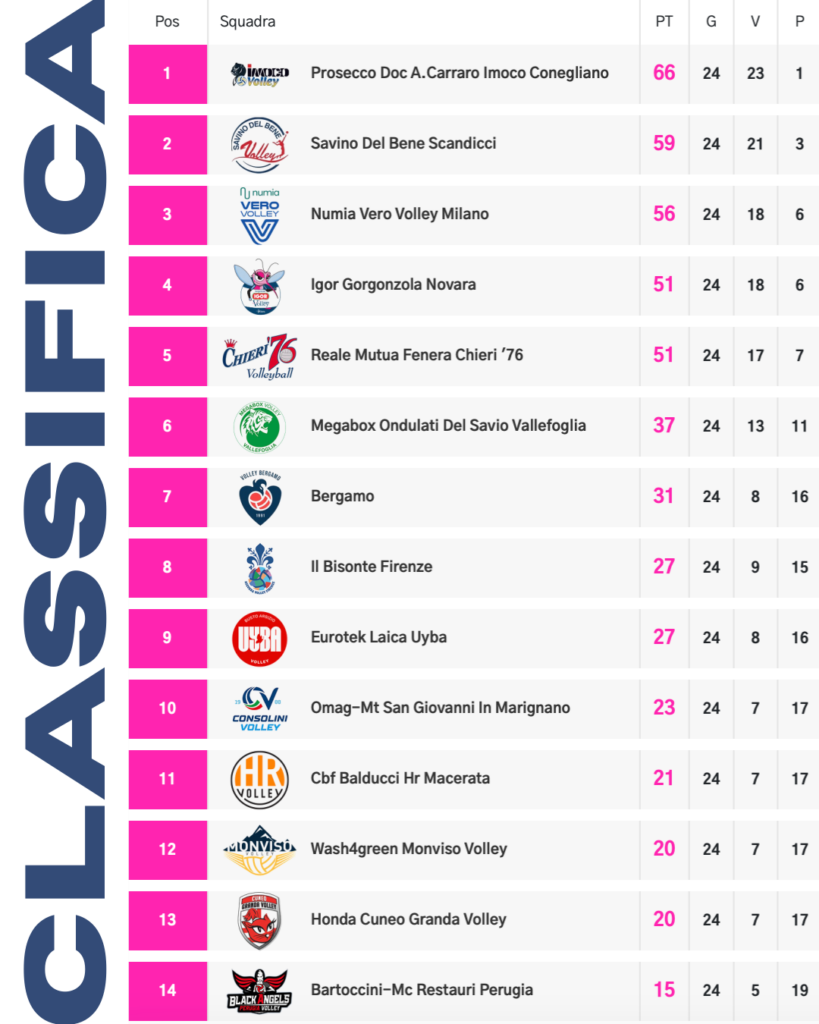 Rischia fortemente di non muovere la propria classifica anche Monviso, che invece Vallefoglia l’affronterà già questo weekend, per altro in trasferta, e nell’ultima giornata ospiterà Conegliano. Monviso e Cuneo al momento hanno gli stessi punti e lo stesso numero di vittorie, dunque, anche in caso di doppia sconfitta per entrambe nelle ultime due giornate, decisivi saranno i set vinti. Il quoziente set oggi è di 0.61 per Monviso e 0.47 per Cuneo.