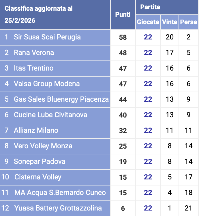 La regular season di Superlega si chiude senza colpi di scena nell’ultima giornata: nella corsa al terzo posto Trento asfalta Cisterna e centra l’obiettivo rendendo inutile il successo da tre punti di Modena contro la ‘Verona B’ (causa tante assenze per virus). Cade invece Piacenza a Padova, con i veneti che rimontano dallo 0-2 e poi fanno festa al tie-break. Vincono tutte per 3-0 invece Perugia, Civitanova e Milano.