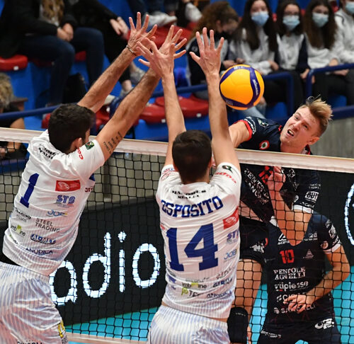 Arriva la prima vittoria in campionato per la Sieco Service, che batte in tre set la Synergy. Santangelo protagonista con 22 punti