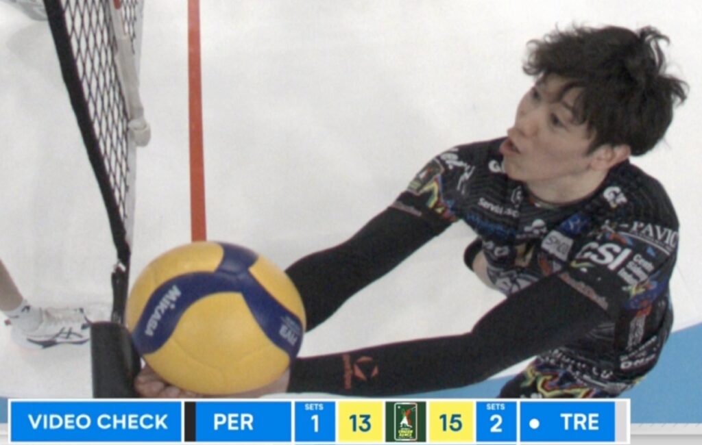 Attacco di Ishikawa, il muro tocca, copertura in tuffo di Solè, la palla si alza radente la rete, Ishikawa la colpisce in bagher toccando con le mani la parte di corda inferiore fuori asta, Giannelli attacca di prima intenzione, la palla finisce out. Il primo arbitro Simbari stende il braccio dalla parte del campo di Trento, gesto che conferma la decisione: palla out. Giannelli chiede subito il tocco del muro, Simbari gli risponde che Perugia, se lo vuole, può chiamare il videocheck, ma a questo punto l’attenzione si sposta dall’altra parte della rete dove il secondo arbitro Puecher ravvisa un’infrazione avvenuta precedentemente l’attacco di Giannelli che ha concluso l’azione. Inizialmente sembra faccia riferimento a una presunta invasione di Ishikawa, cosa che siamo propensi a escludere perché il tocco del giocatore con la rete è avvenuto fuori asta, dunque chiamare invasione sarebbe stato un errore.