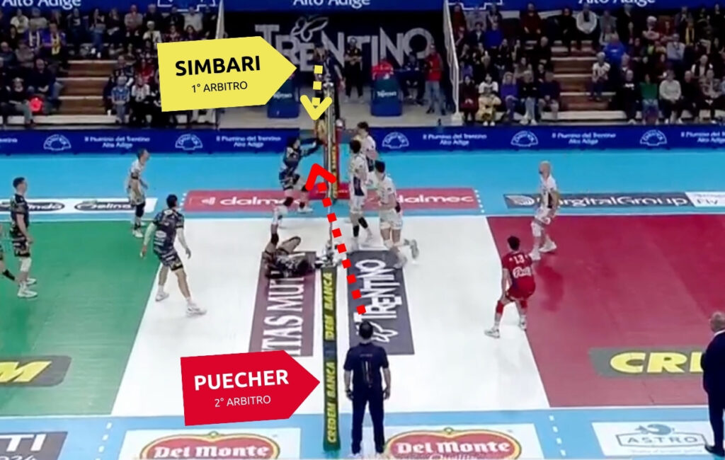 Puecher, evidentemente, ha ravvisato invece il tocco della palla sulla corda inferiore fuori asta. Qui, al limite, si potrebbe discutere se tale decisione rientrasse nelle sue competenze in considerazione del fatto che, durante lo svolgimento dell’azione in oggetto, Puecher era posizionato alla destra del palo dalla parte del campo di Trento. La parte del campo di Perugia, da regolamento (24.3.2.7) in quel momento non sarebbe stata di sua competenza. Dal frame qui in basso si nota anche come invece Simbari sia chinato verso Ishikawa per valutare da pochi centimetri un’eventuale irregolarità. Irregolarità che, come detto prima, lui non ravvisa perché fischia solo palla out al termine di tutta l’azione.