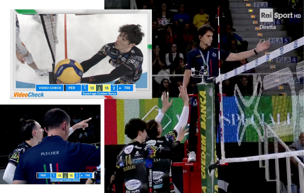 Un altro fatto poco chiaro ai nostri lettori (ma se lo sono chiesti anche i telecronisti della Rai, Colantoni e Lucchetta, in cronaca) è chi abbia chiamato successivamente il videocheck. Di certo non il primo arbitro Simbari, perché da regolamento, dopo una decisione presa, un arbitro non può chiamare il video challenge per se stesso. E, lo ripetiamo, la decisione presa in prima battuta da Simbari era stata palla out. Siamo quindi portati a credere che lo abbia fatto la panchina di Perugia, che però non ha potuto chiedere la revisione sul tocco a muro, come voleva e pensava inizialmente Giannelli, ma a questo punto, vista la decisione/segnalazione di Puecher, non può aver fatto altro che chiedere il videocheck per constatare il tocco della palla sulla corda esterna all’asta.