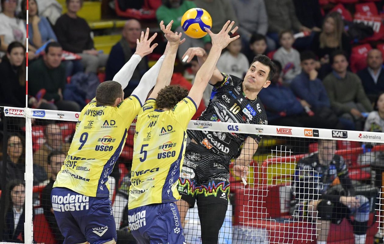 Con la pipe di Plotntytskyi, il maniout di Semeniuk e di nuovo Plotnytskyi, che trova il varco lungo la parallela, Perugia recupera il gap e torna a contatto e Giannelli chiude lo scambio che vale il nuovo equilibrio (16-16). Ace di Semeniuk e vantaggio per i padroni di casa. Il muro di Plotnytskyi su Buchegger vale il +2, Davyskiba riporta i suoi a contatto e il muro di Porro su Ben Tara scrive una nuova parità in questo intenso primo set che regala al pubblico un finale incandescente. Davyskiba gioca sulle mani del muro lungo la parallela, Ben Tara va a segno, ma il nuovo maniout di Davyskyiba vale il set point per gli emiliani, annullato da Loser che porta il set ai vantaggi. Lo schiacciatore bulgaro di casa gialloblù centra un altro maniout, ma spara il servizio in rete, capitan Giannelli mura l’attacco di Porro e questa volta sono i padroni di casa ad avere in mano il set point. L’invasione di Porro vale l’1-0 Perugia.
